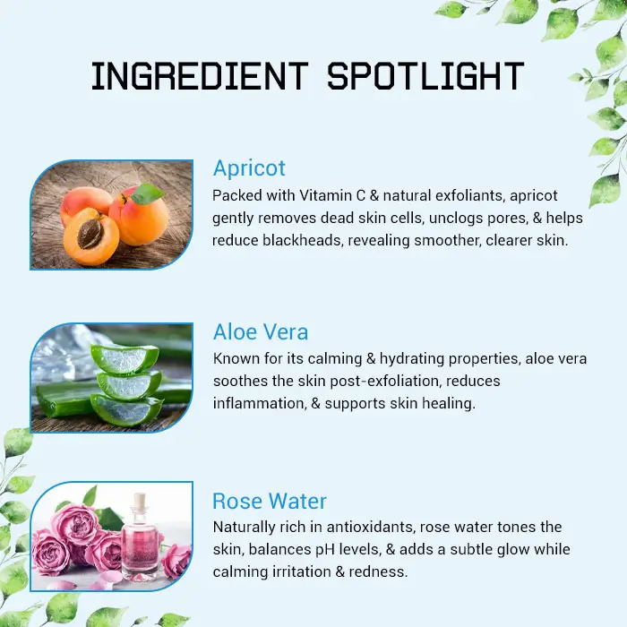 Its primary function is to gently exfoliate, removing impurities, dirt, and excess oil while nourishing your skin with the natural goodness of apricot. Packed with antioxidants and hydrating properties, it works wonders to: